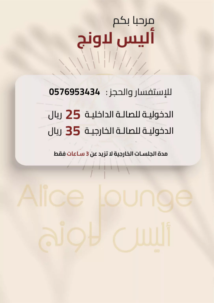 About Alice Lounge Order Now (soon) Call us: +966576953434 Al Suwaidi - Western Ring Road, Riyadh, Saudi Arabia Alicelounge2023@gmail.com Follow us: Snapchat Menu All rights reserved ALICE LOUNGE @2023Developed by Qutell Technology